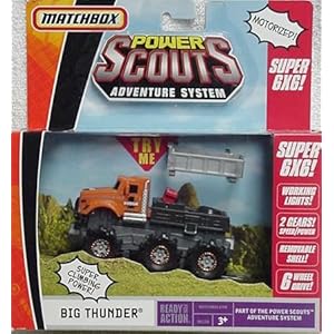 Matchbox Power Scouts Adventure System Big Thunder features a truck with more power, more torque and more action. This 6-wheeled truck has 2 speeds: shift to lower gear for more climbing and pulling power; and shift up to speed past the toughest obstacles. Features working headlights for night driving action. Cool add-on accessories.